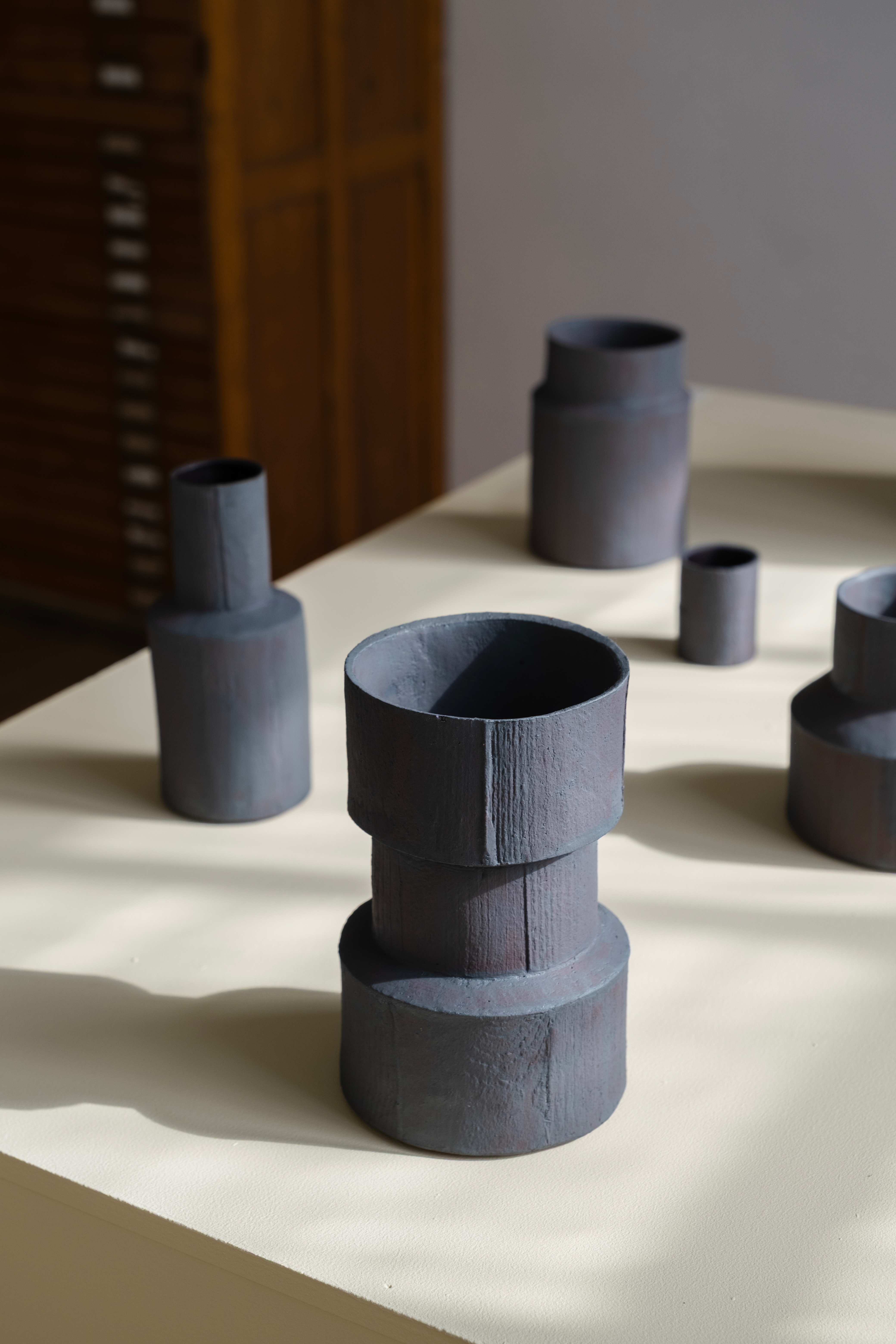 Hedvig Hammarberg är utbildad vid Högskolan för Design och Konsthantverk i Göteborg och har en master i keramikkonst från 2009. Hennes arbeten finner sin näring i det urbana och spänner från skulpturala till funktionella objekt. Leran ringlas och pressas i gipsformar. Ytorna lämnas ofta råa och oglaserade men under 2025 har en ny serie unika kärl tillkommit där vart och ett av dem fått sin egen glasyr. Ofta blir hennes keramiska objekt delar som trivs ihop och tillsammans bildar en större helhet.