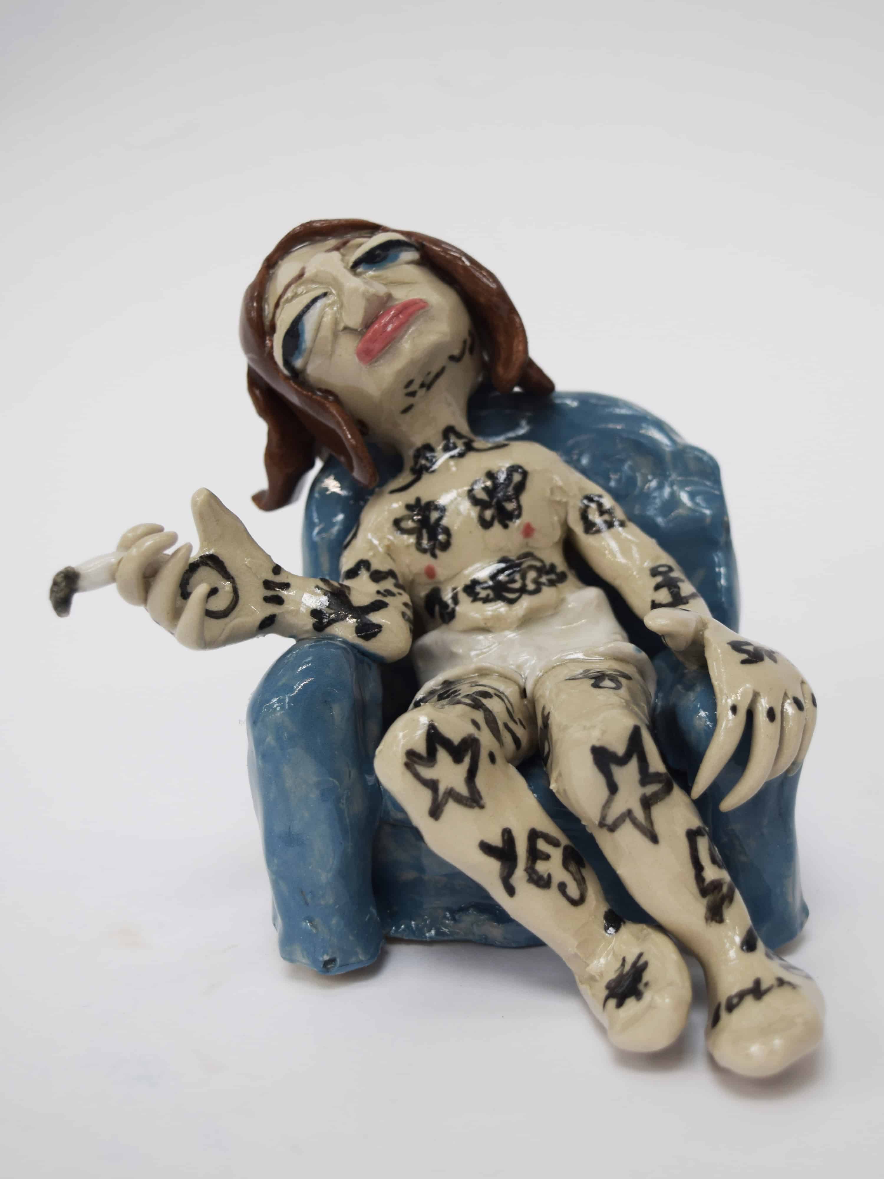 Jag jobbar med lera på olika sätt och låter materialets egenhet få ett finger med i leken. Det blir oftast människofigurer, vare sig arbetet är keramiskt eller leranimerat. Inspirationen bakom verken kommer från en fascination av människors interaktioner med varandra och sig själva. Jag kommunicerar erfarenheter och känslor, och finner mig ofta i att undra varför vissa av dem får oss att skämmas.